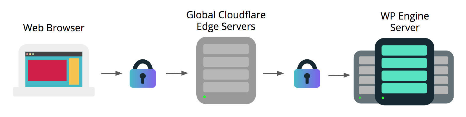 WP Engine’s Global Edge Security offering will automatically install the SSL certificates added in the WP Engine User Portal on the Cloudflare Edge servers. In this way both the connection between the end-user’s web browser and Cloudflare will be encrypted, as well as the connection between Cloudflare and WP Engine.