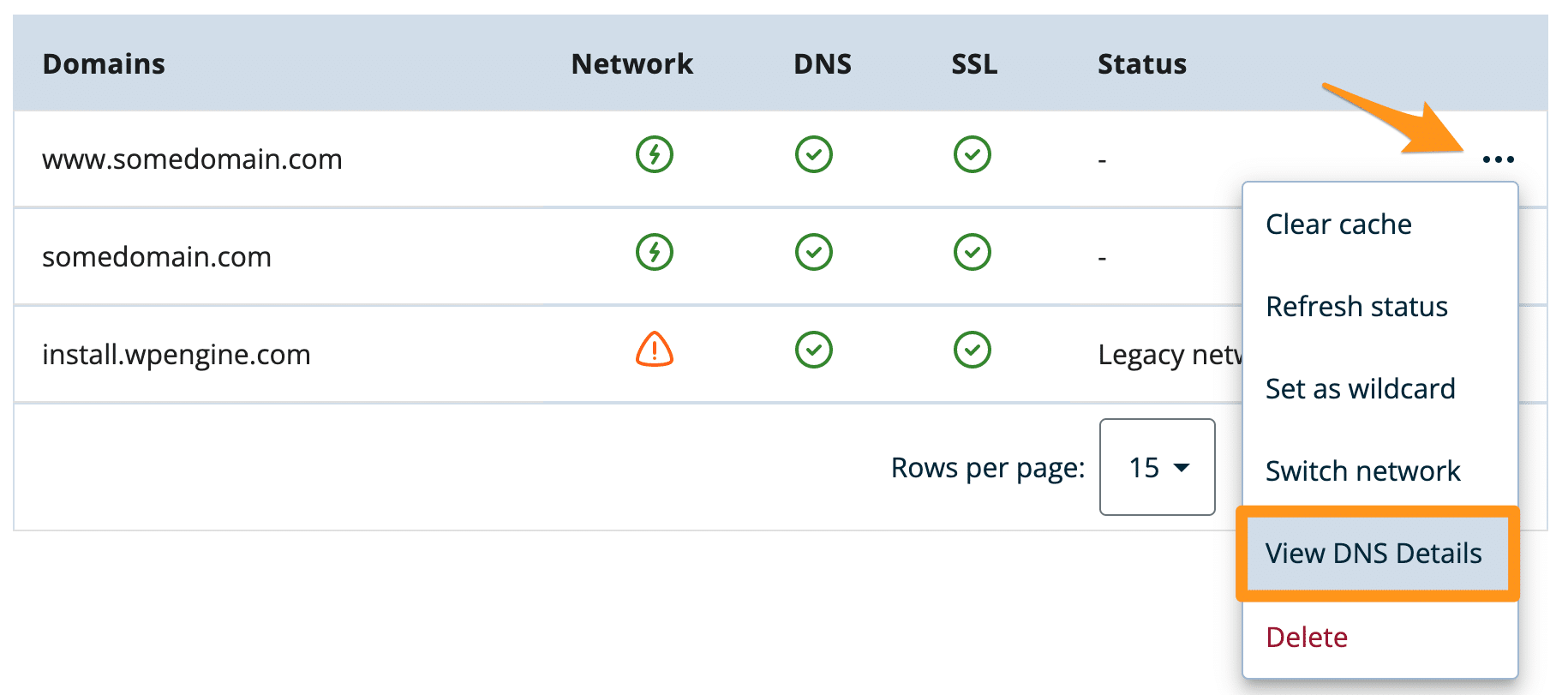 - Expand the 3 dot menu icon to the right of the domain