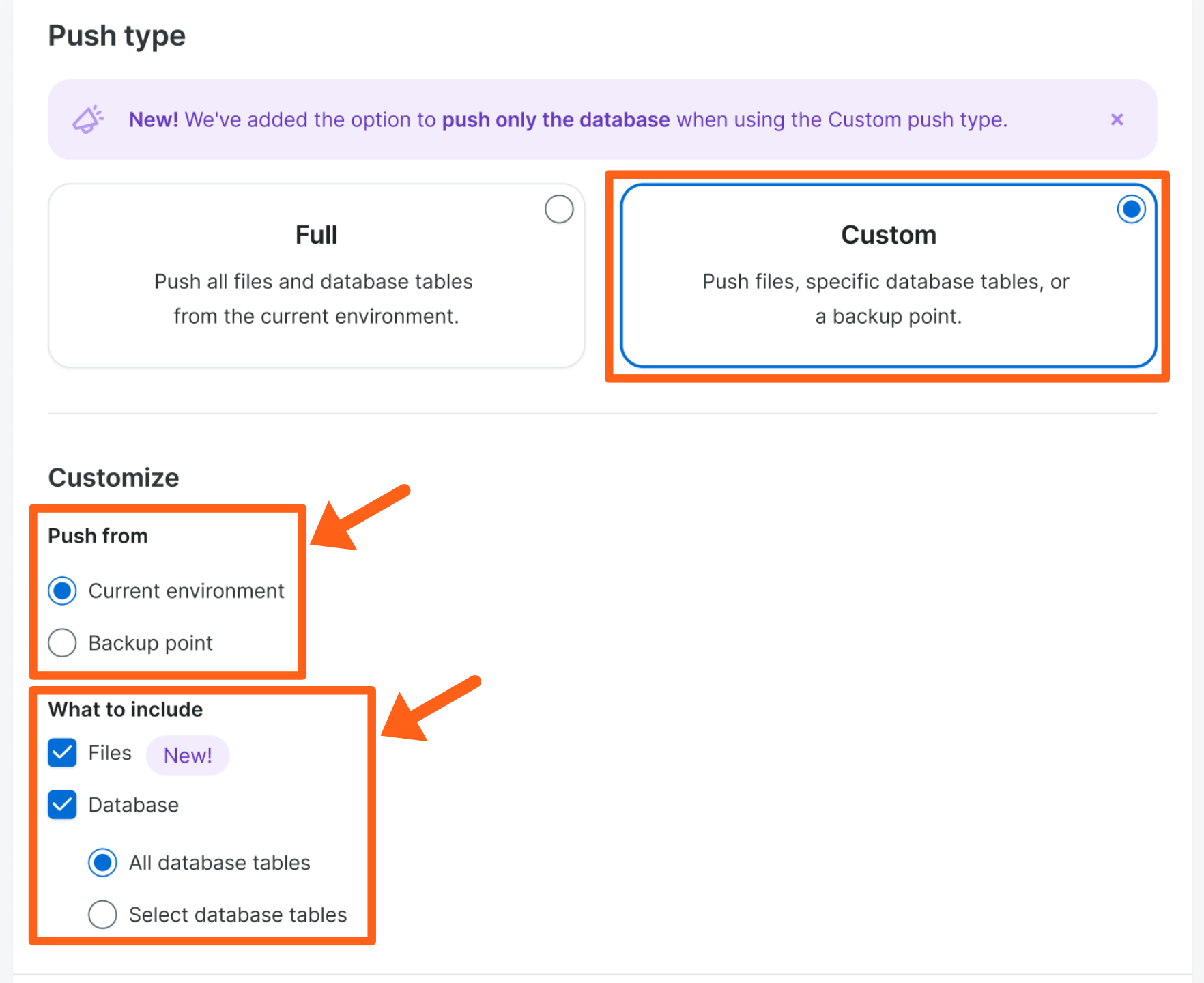 - We do not recommend pushing the entire database to the production environment. If you do, the production database will be completely overwritten. This can cause the live website to lose important data like new orders or new users, so be very careful when choosing this option.