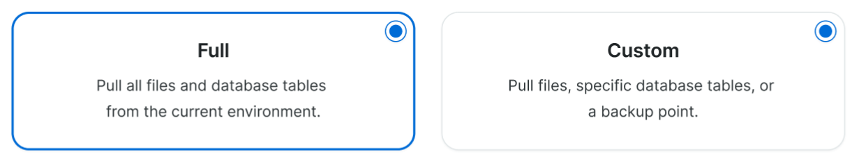 - Custom: A custom copy lets you choose whether to copy the current state of the environment or a specific backup, and whether or not to include the file system or the database.