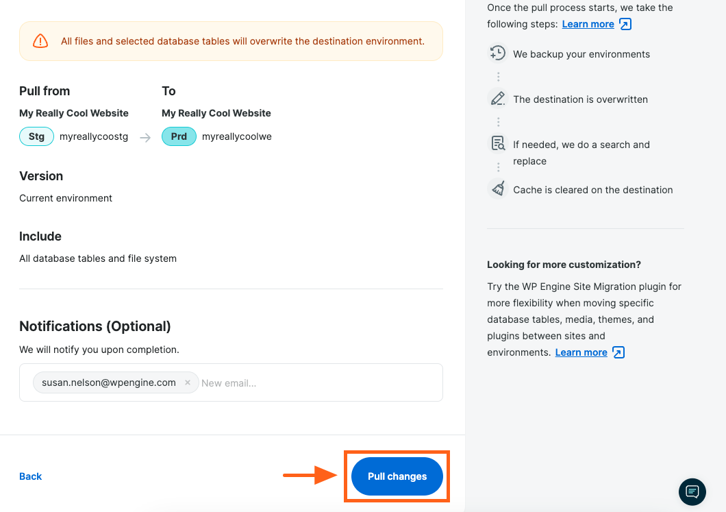 When the process is complete, and if you enabled the email notification, you will receive an email at the address(es) you provided confirming it was successful. Additionally, we will create a backup checkpoint of the destination environment.