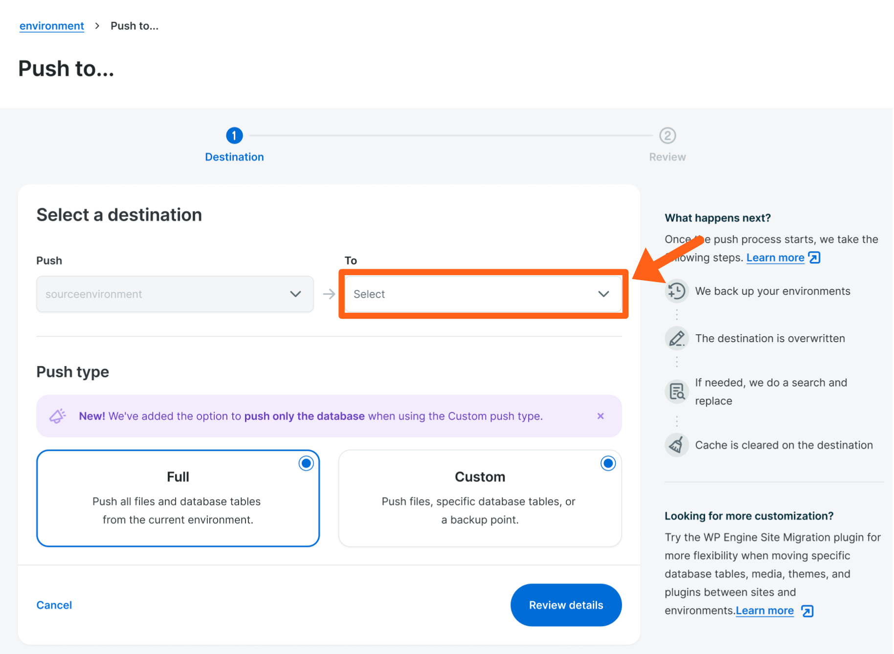 - The destination environment is grayed out because you cannot change it on this page. However, if you selected the incorrect environment, you can click the site name in the breadcrumb menu at the top of the page to start over.