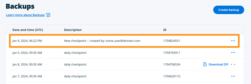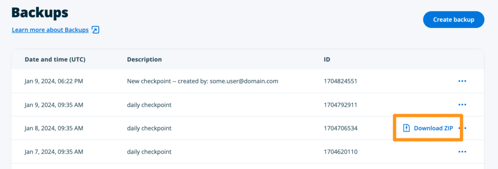 When a backup is requested, it is first compiled. Once the backup has been prepared it can be downloaded from the Backups page by clicking Download ZIP next to the checkpoint. The Download ZIP links for backups cannot be manually deleted and any backup that’s already been prepared can be downloaded from this page for up to 7 days.