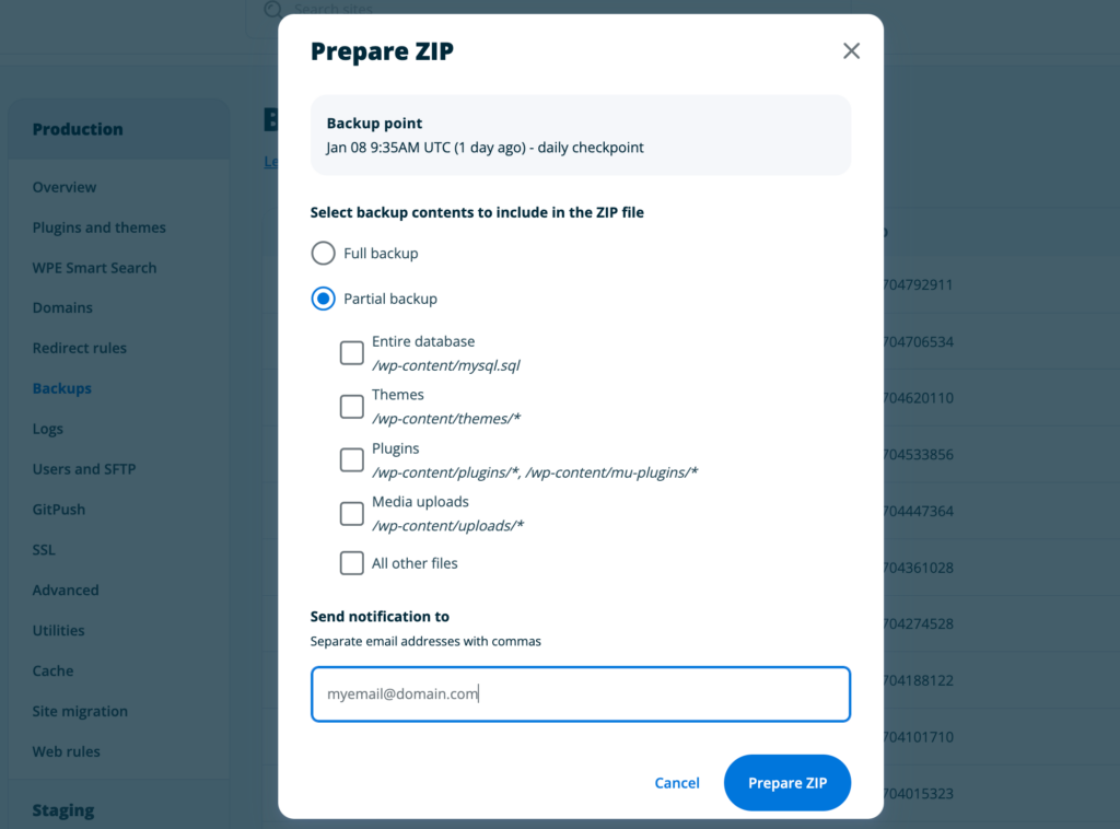 Backups can be downloaded as a ZIP archive and can be requested as full or partial. If you have a large site, or need to manually restore a single directory, partial backups can be useful. The last 40 backups taken on an environment can be accessed on the Backups page. Our support team can also access backups for the last 60 days if you need a backup outside of the 40 most recent backups.