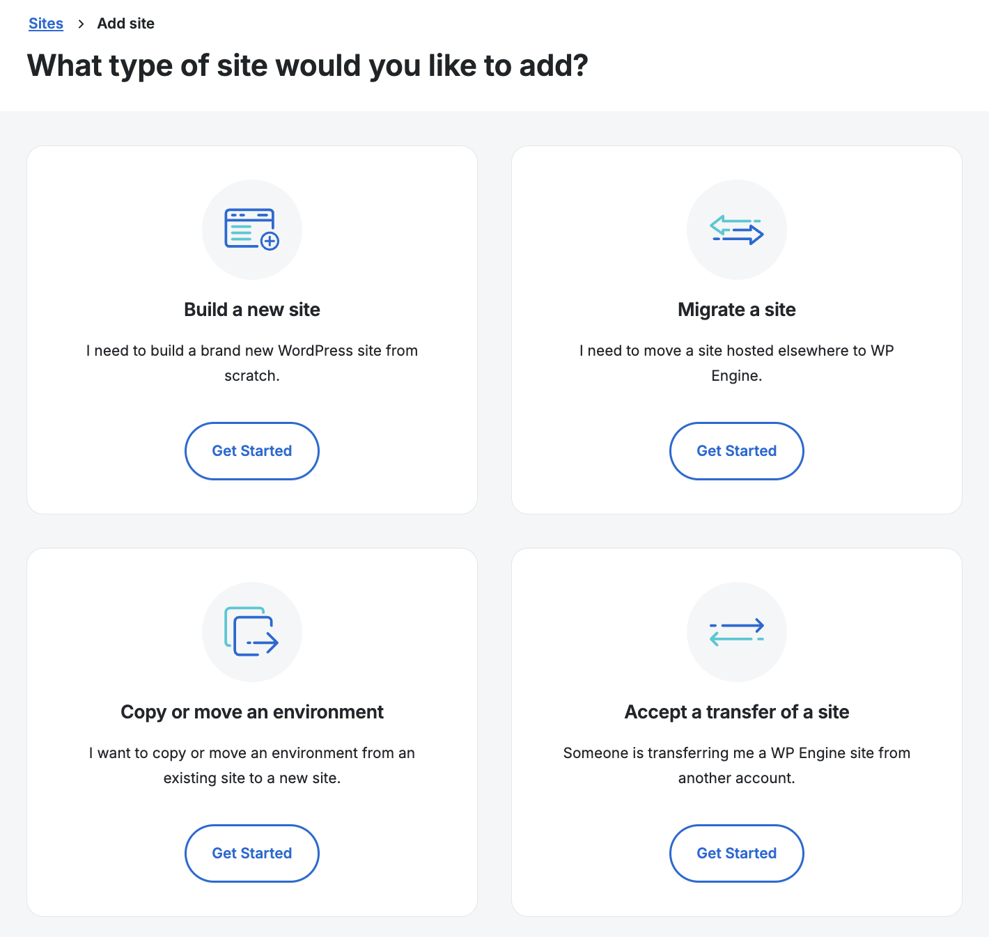 If you don’t have any sites yet you’ll see a different screen where you can use the Build a new site or Migrate a site to WP Engine workflows like the image below. You’ll also see an Accept a site transfer option at the bottom, but you won’t see the Copy Environment option if you don’t have any sites yet.