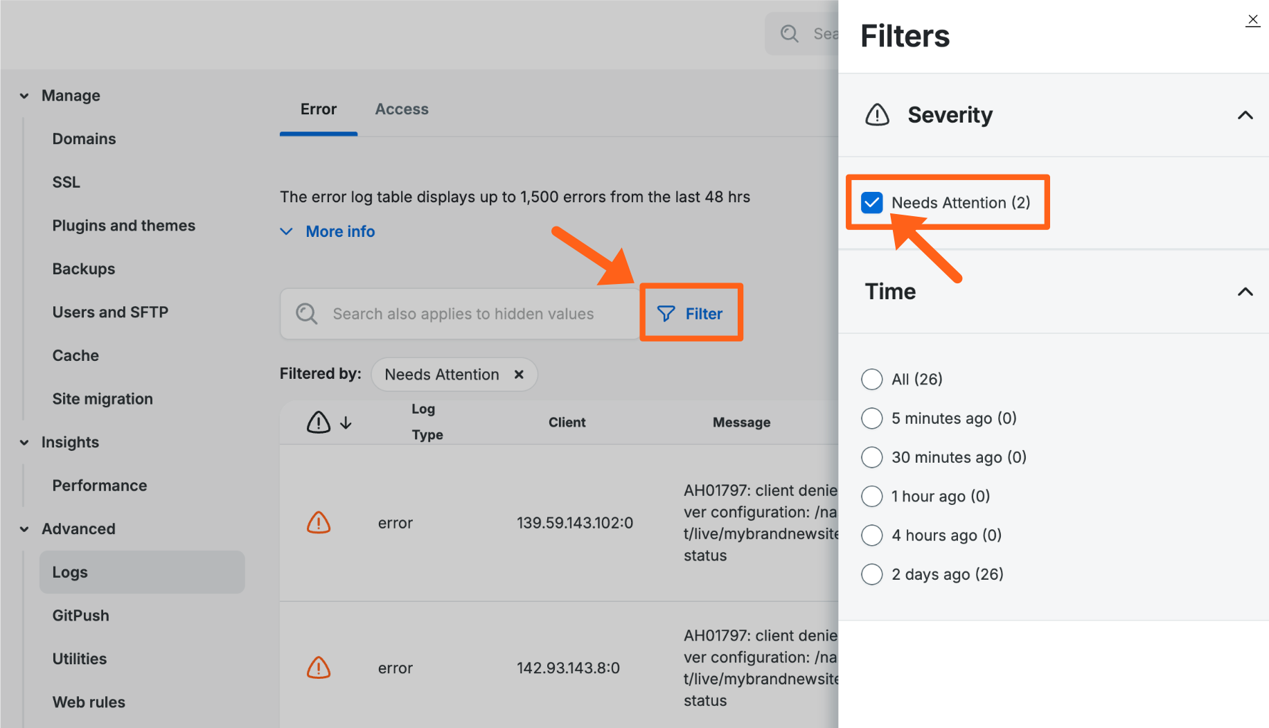 To see specific server errors like WordPress PHP errors, you can view the error logs. You can use the Filter button pictured below to select the Needs Attention filter. This should show only errors and filter out notices which are just warnings and not errors.