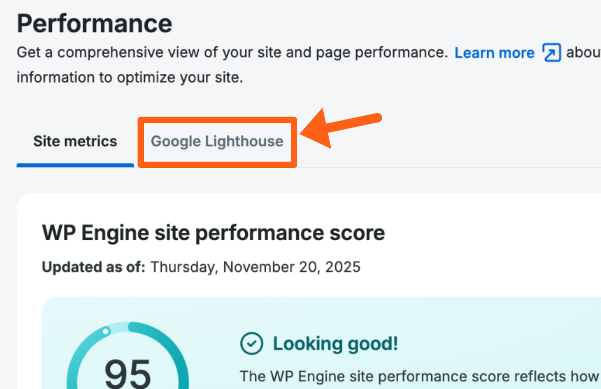 You can also see your Google Lighthouse scores on the performance page by selecting the Google Lighthouse tab as shown below. Read more about your Google Lighthouse scores.