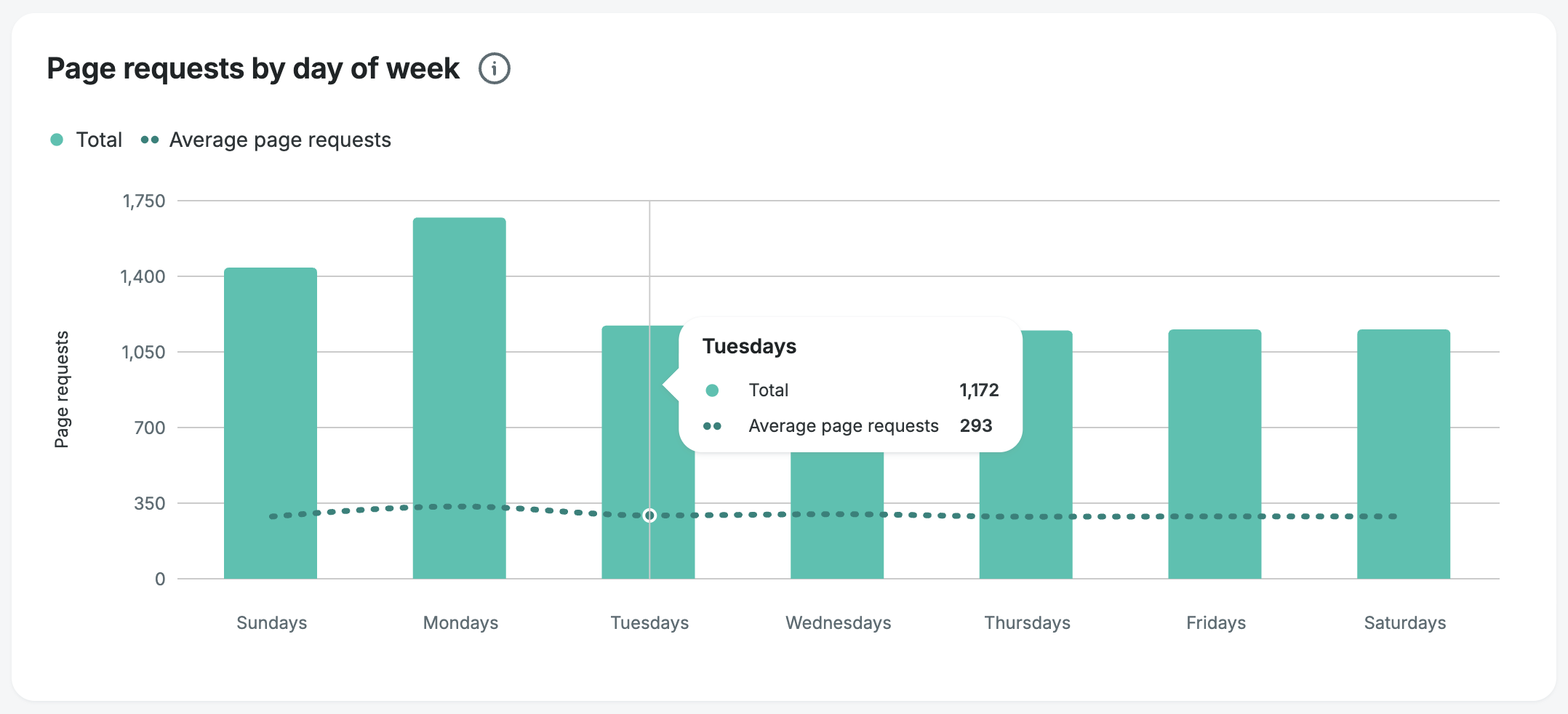 The page requests by day of week graph allows you to see which days of the week have the highest total traffic, and which days of the week have the highest average traffic, over your selected date range.