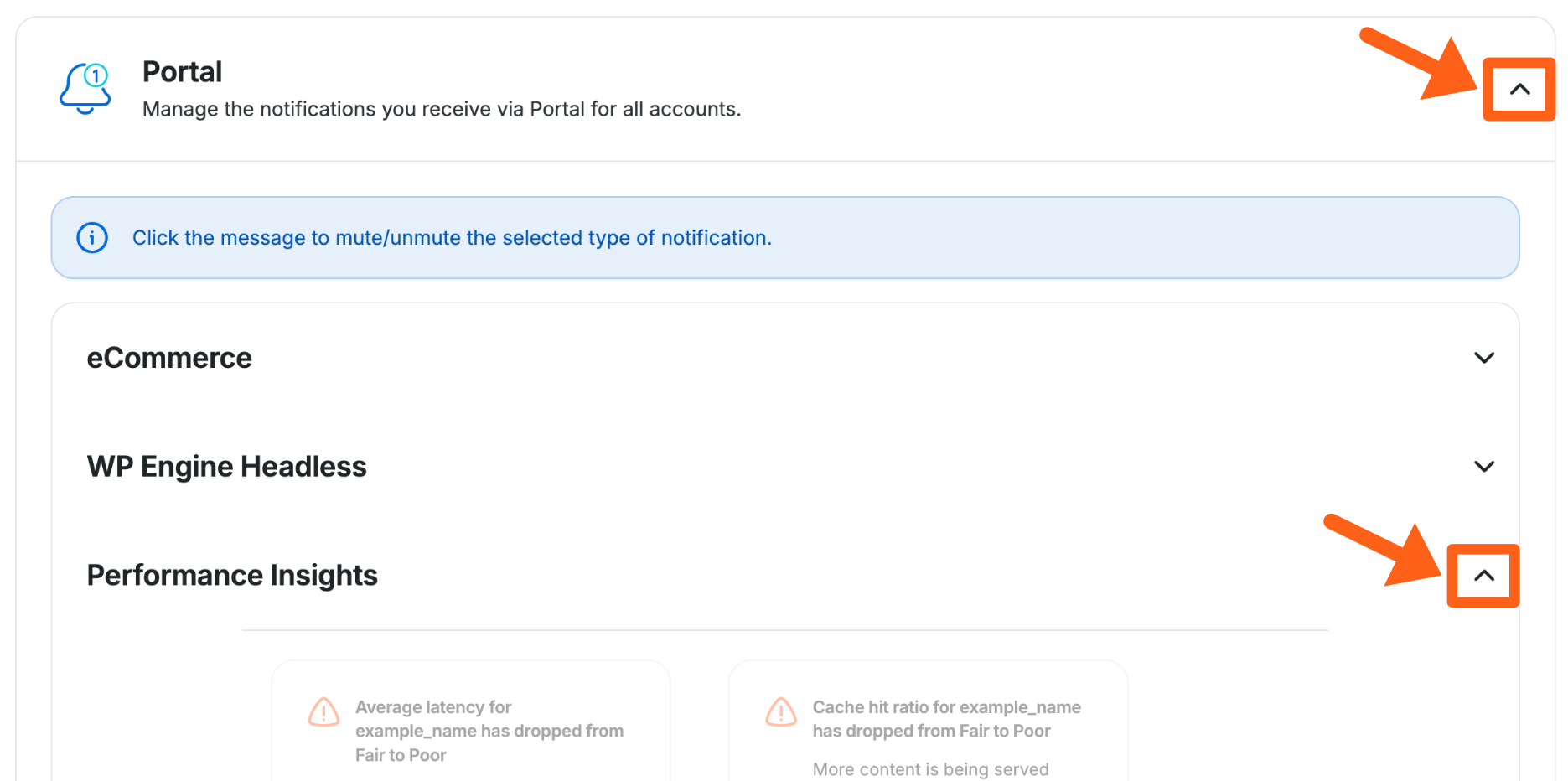 To choose your notification method you can navigate to the Notification Settings page. In addition to using the link you can also navigate there by using the Notification settings button on the Insights > Performance page for an environment. The link will be in the WP Engine site performance score section. You can also click the Bell icon in the top right of the Portal, and then click the Gear icon. You can see both options in the image below.