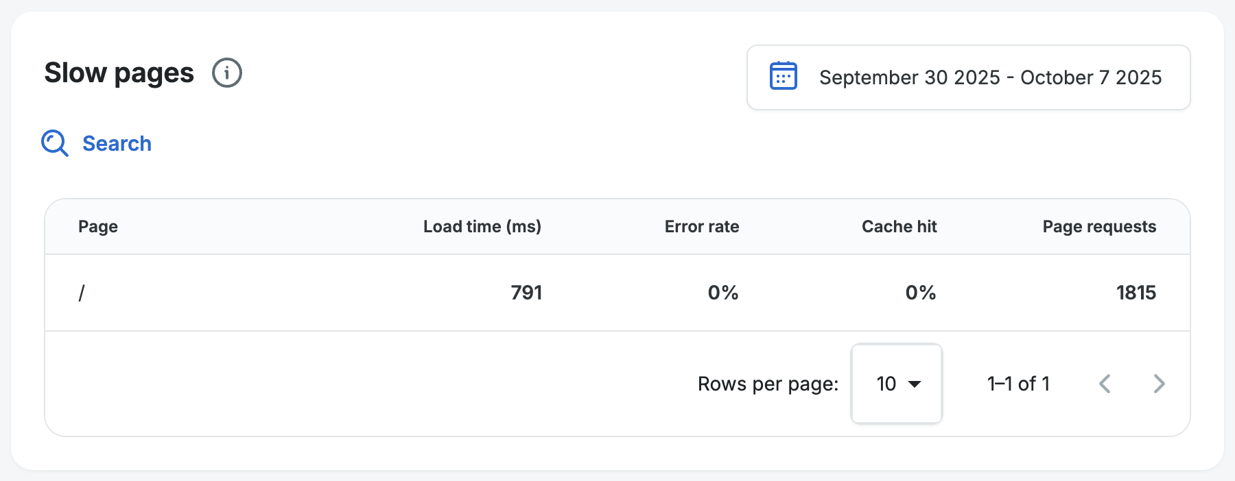 This table will show the slowest pages recently viewed for your website, even if all of your pages are fast like the example below where the average load time is 0.79 seconds (791ms).