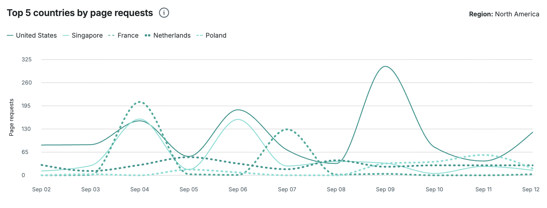 The top 5 countries by page requests graph shows page requests for the 5 countries with the highest total page request count for the time range selected. You can see specific information about each day when hovering along each line on the graph.