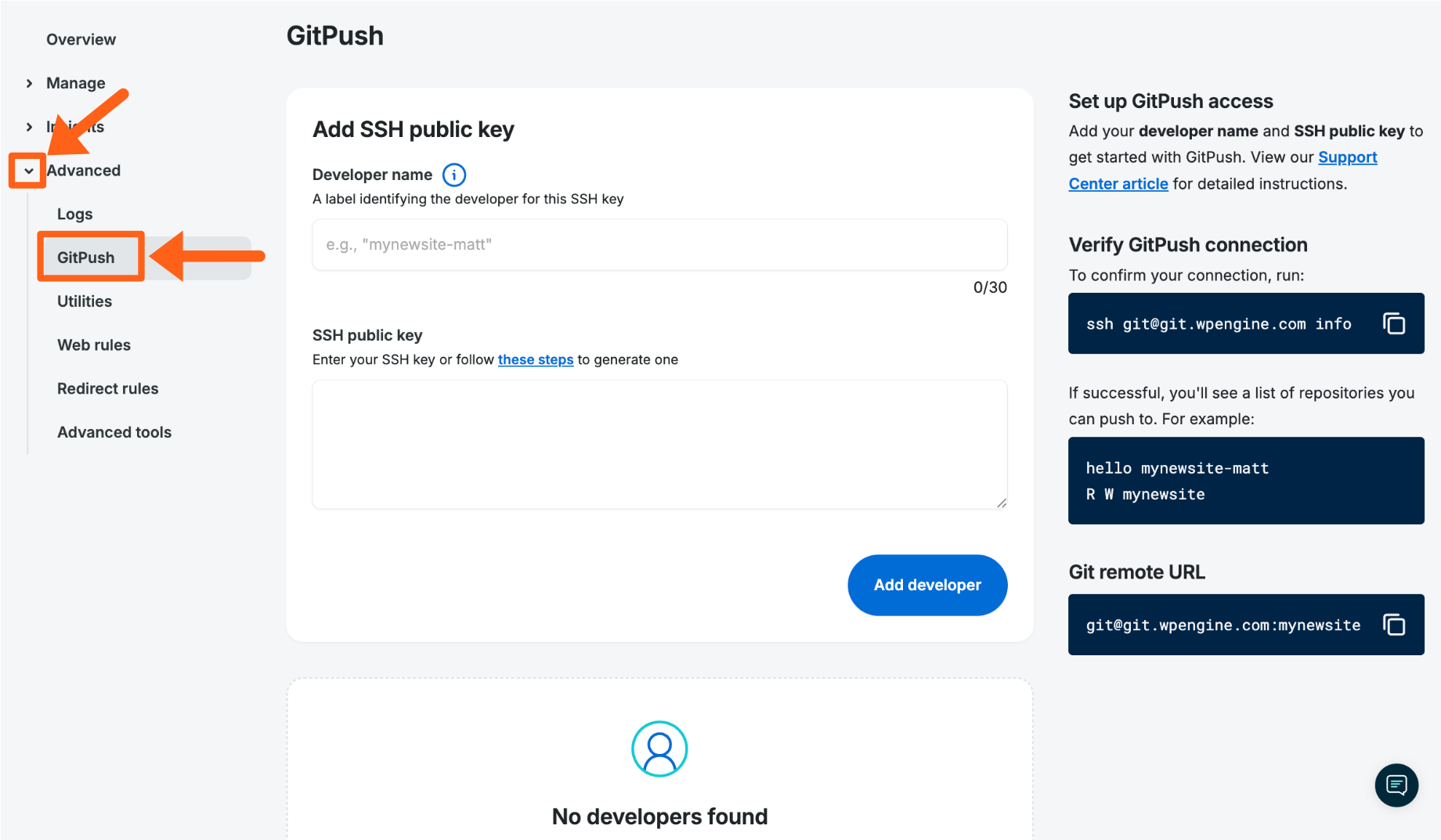 Be sure to add the public key to all environments individually for GitPush. Once the key has been added in WP Engine User Portal it can be added to additional environments by adding the key and same developer name to a different environment, as shown above.