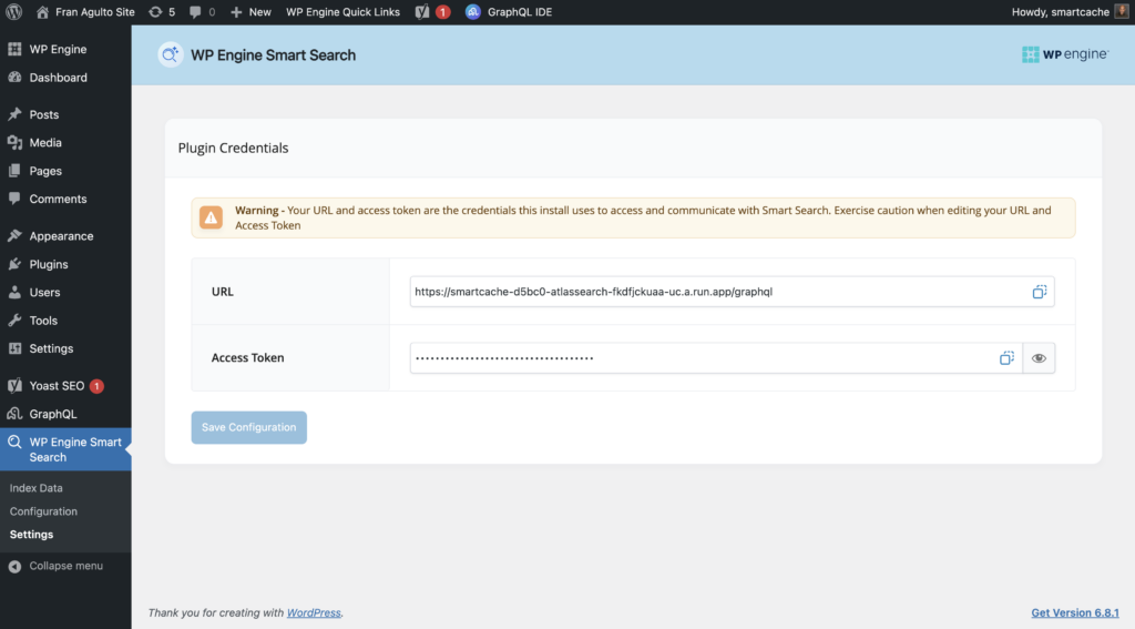 3. Navigate to the WP Admin of your install. Inside your WP Admin, go to WP Engine Smart Search > Settings. You will find your Smart Search URL and access token here. Copy and save it. We will need it later. You should see this page: