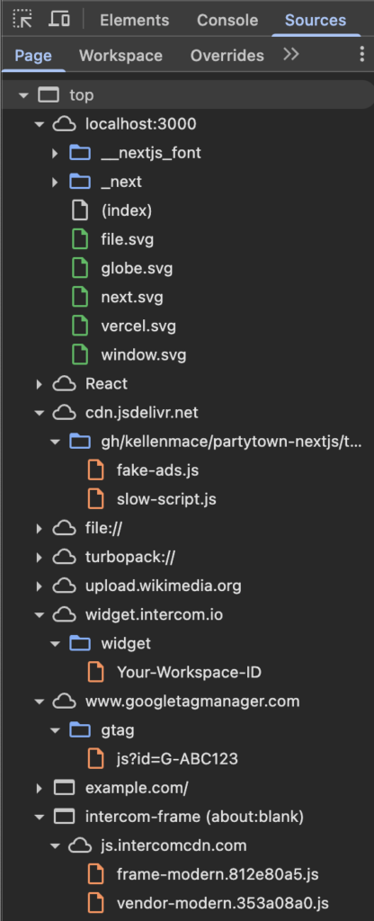 After implementing this, open Chrome DevTools and check the Sources tab. Youâll see the third-party scripts now load in a web worker (rather than under the main âtopâ frame), confirming that Partytown is working, just as we did in our tests.