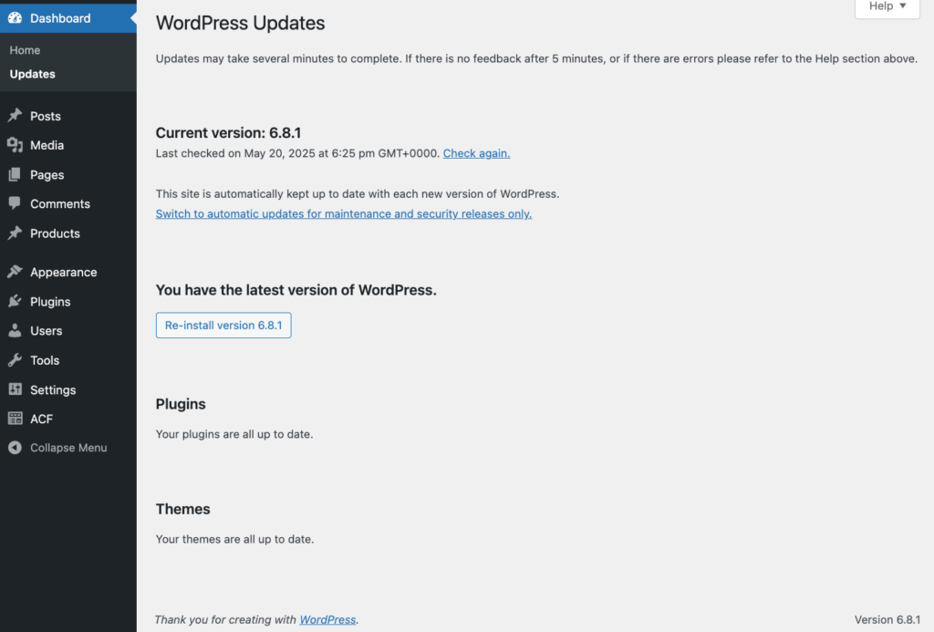 Fortunately, WordPress has a built-in repair tool. Go to Dashboard > Updates and click the “Re-install version X.X” button. This replaces core files without affecting your content, plugins, or themes. If you’re locked out of the dashboard, manually replace the core files via FTP. Download a fresh copy of WordPress from wordpress.org, extract the files, and upload everything except the wp-content folder and wp-config.php file to your server.