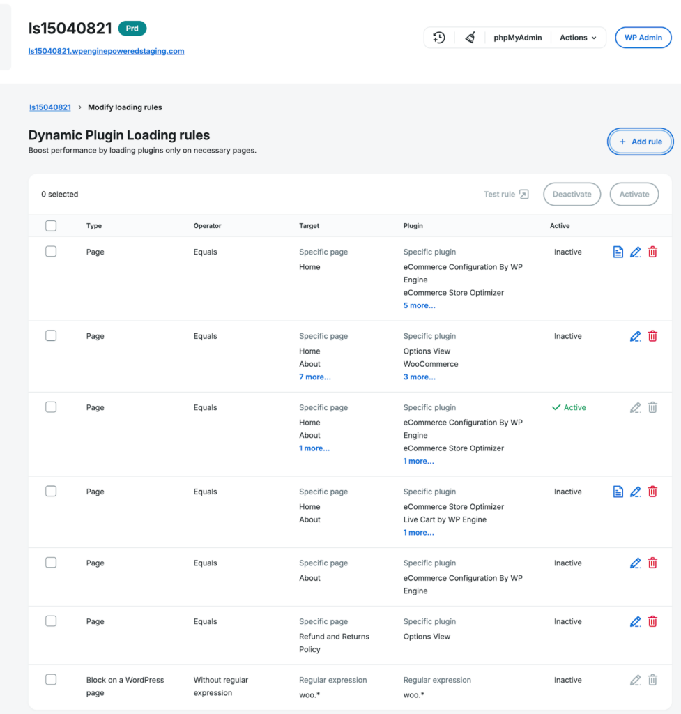 Easy setup: Activate dynamic plugin loading with a simple toggle in your WP Engine User Portal. For new eCommerce sites, dynamic plugin loading is enabled by default, including one default rule to disable all WooCommerce-related plugins on non-eCommerce pages.