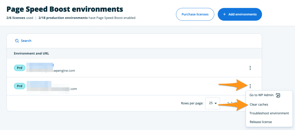 Screenshot of an environment's Page Speed Boost page in the WP Engine User Portal showing where to filter by environments that don't need a Page Speed Boost license