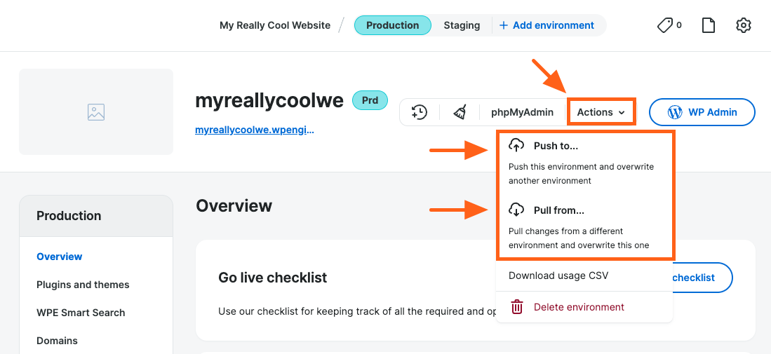For example, if you have been working on your website in the staging environment and now you are ready to publish everything to your live website, you can push staging to production.