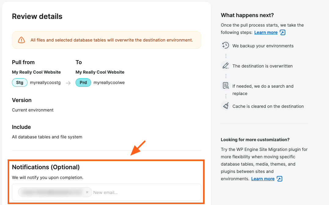 When the process is complete, and if you enabled the email notification, you will receive an email at the address(es) you provided confirming it was successful. Additionally, we will create a backup checkpoint of the destination environment.