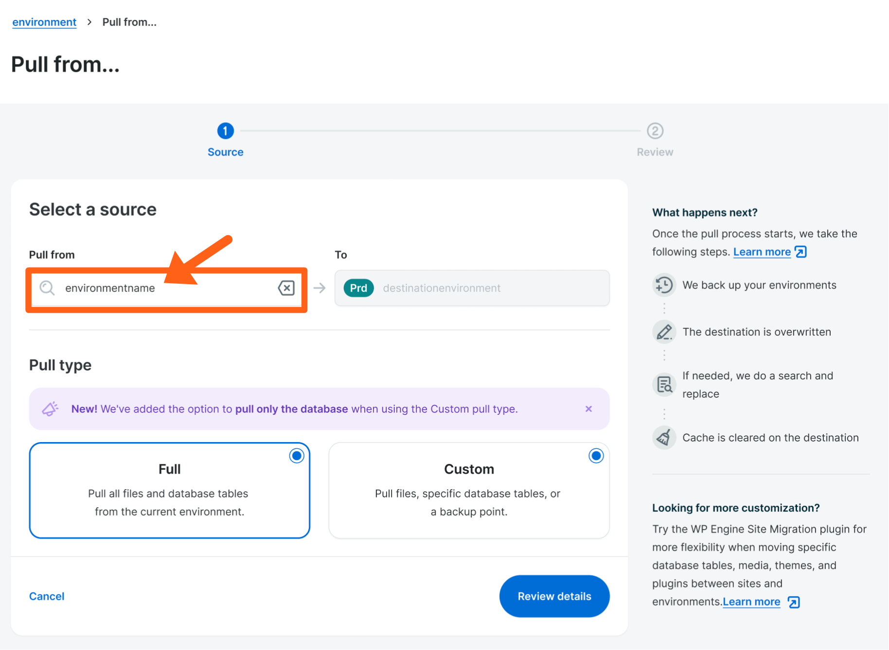 - Select the source environment that you want to “Pull from” as shown below.