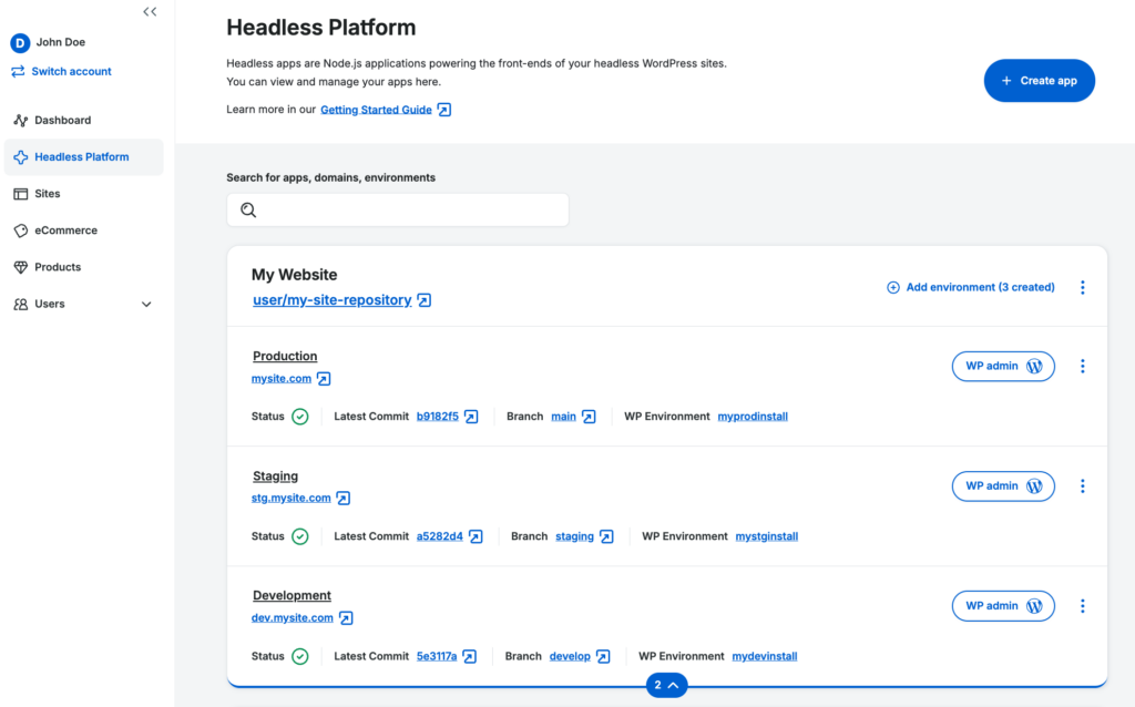 Each app environment is paired with a WordPress backend. In the WP Engine User Portal, the equivalent of an app is a site. A site has environments just like apps.