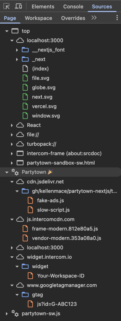 After implementing this, open Chrome DevTools and check the Sources tab. Youâll see the third-party scripts now load in a web worker (rather than under the main âtopâ frame), confirming that Partytown is working, just as we did in our tests.