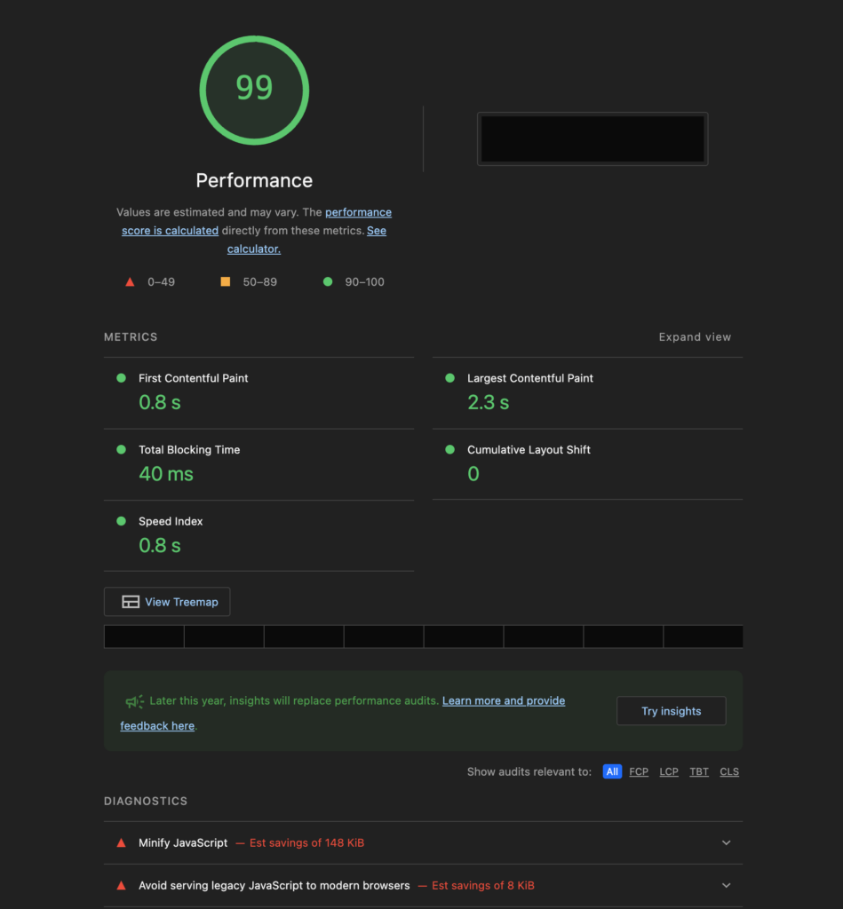 Note that the performance score is now 99/100, and that the âMinimize main-thread workâ and âReduce the impact of third-party codeâ are no longer present on the list of issues. Vastly improved!