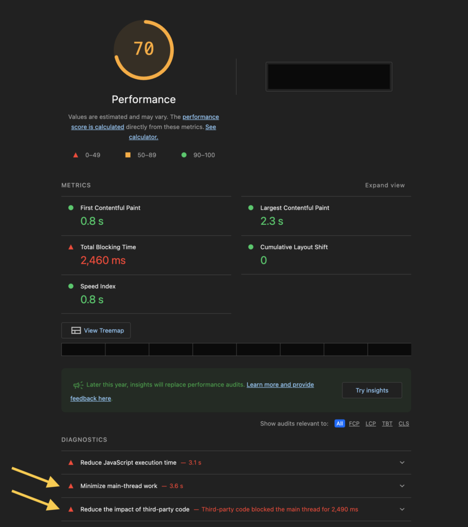 Note that the overall performance score is only 70/100, and that two of the main culprits are the âMinimize main-thread workâ and âReduce the impact of third-party codeâ items on the list.